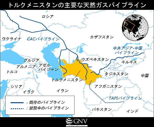 また、トルクメニスタンは天然資源大国であり、ガスの販売収入に大きく依存している。 国営メディアによると、同国はアフガニスタン、パキスタン、インドでもガスパイプラインを建設中である。参照記事