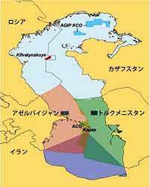 左は、カスピ海に於ける周辺国の資源開発の権益の分布図。cefe9a41-s