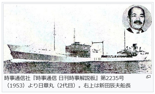 時事通信社『時事通信 日刊時事解説板』第2235号(1953)より日章丸(2代目)。右上は新田辰夫船長