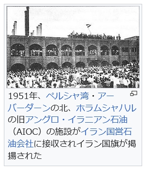 1951年、ペルシャ湾・アーバーダーンの北、ホラムシャハルの旧アングロ・イラニアン石油(AIOC)の施設がイラン国営石油会社に接収されイラン国旗が掲揚された