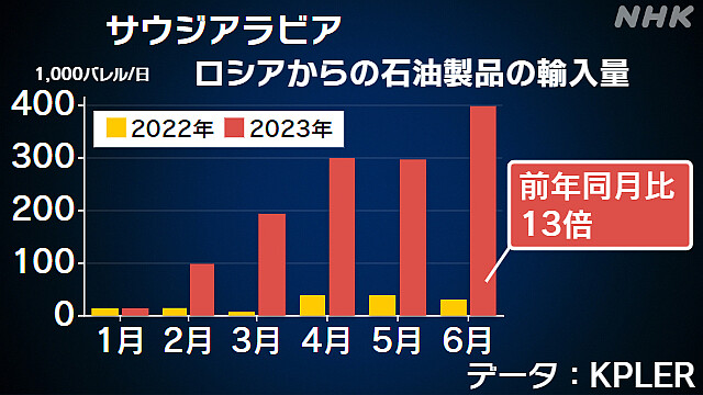サウジアラビアは、2022年2月24日のロシアのウクライナ侵攻以降の2023年2月ごろから、ロシアからの石油製品の輸入量を大幅に拡大し、1月~6月までの半年間で比較すると、前の年の同じ時期に比べ、なんと9倍以上に増え、主要な輸入先の中で最も増えていた。6月1か月だけでみると、13倍と驚異的な増加量だった。