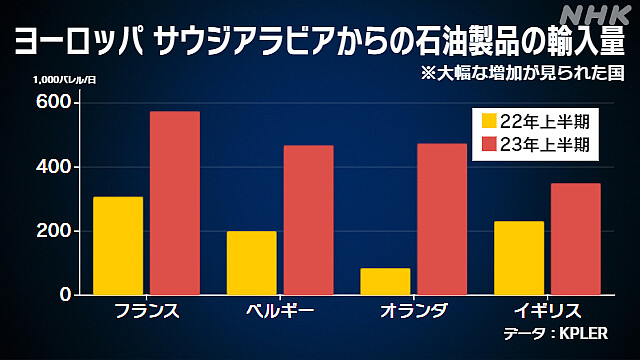 実際、2023年上半期にサウジアラビアから各国が輸入した石油製品は、前の年の同じ時期に比べて、オランダで5.9倍、ベルギーで2.3倍、フランスで1.8倍などとなり、ヨーロッパの国で増加が目立っていた。