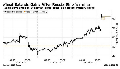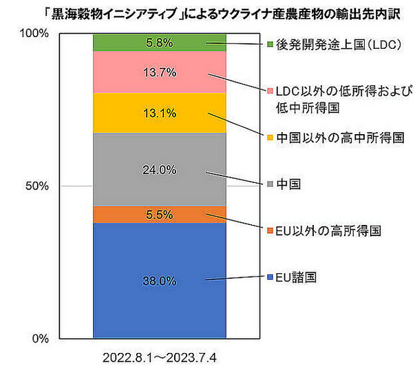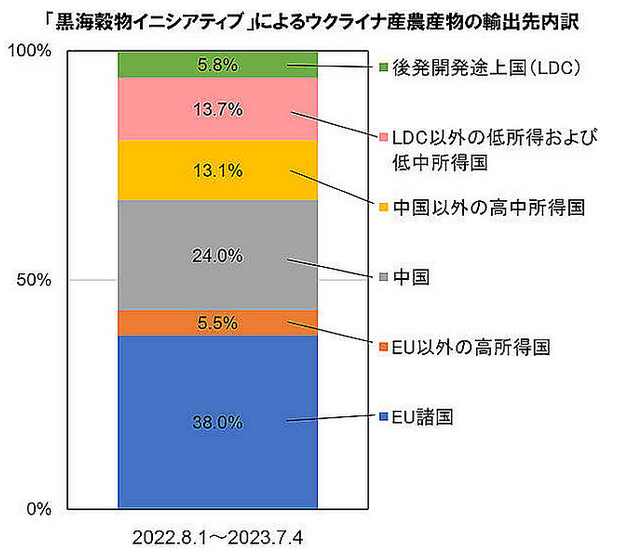 『卸売価格の低下は、時間とともに小売価格にも波及していくとみられる。しかしロシアが7月17日に黒海穀物イニシアチブからの離脱を宣言し、その後、黒海に面したウクライナのチョルノモルスク港とオデッサ港を4夜にわたり攻撃したことで、食料品の市場は混乱に陥り、価格が急騰した。それ以外の地域も、降雨量不足の問題を抱えており、食料品不足が深刻化する可能性が高い。