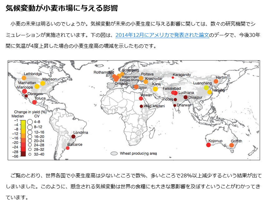 小麦の未来は明るいのでしょうか。気候変動が未来の小麦生産に与える影響に関しては、数々の研究機関でシミュレーションが実施されています。下の図は、2014年12月にアメリカで発表された論文のデータで、今後30年間に気温が4度上昇した場合の小麦生産高の増減を示したものです。