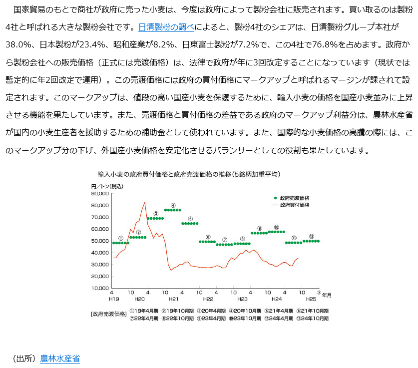 国家貿易のもとで商社が政府に売った小麦は、今度は政府によって製粉会社に販売されます。買い取るのは製粉4社と呼ばれる大きな製粉会社です。日清製粉の調べによると、製粉4社のシェアは、日清製粉グループ本社が38.0%、日本製粉が23.4%、昭和産業が8.2%、日東富士製粉が7.2%で、この4社で76.8%を占めます。政府から製粉会社への販売価格(正式には売渡価格)は、法律で政府が年に3回改定することになっています(現状では暫定的に年2回改定で運用)。この売渡価格には政府の買付価格にマークアップと呼ばれるマージンが課されて設定されます。このマークアップは、値段の高い国産小麦を保護するために、輸入小麦の価格を国産小麦並みに上昇させる機能を果たしています。また、売渡価格と買付価格の差益である政府のマークアップ利益分は、農林水産省が国内の小麦生産者を援助するための補助金として使われています。また、国際的な小麦価格の高騰の際には、このマークアップ分の下げ、外国産小麦価格を安定化させるバランサーとしての役割も果たしています。