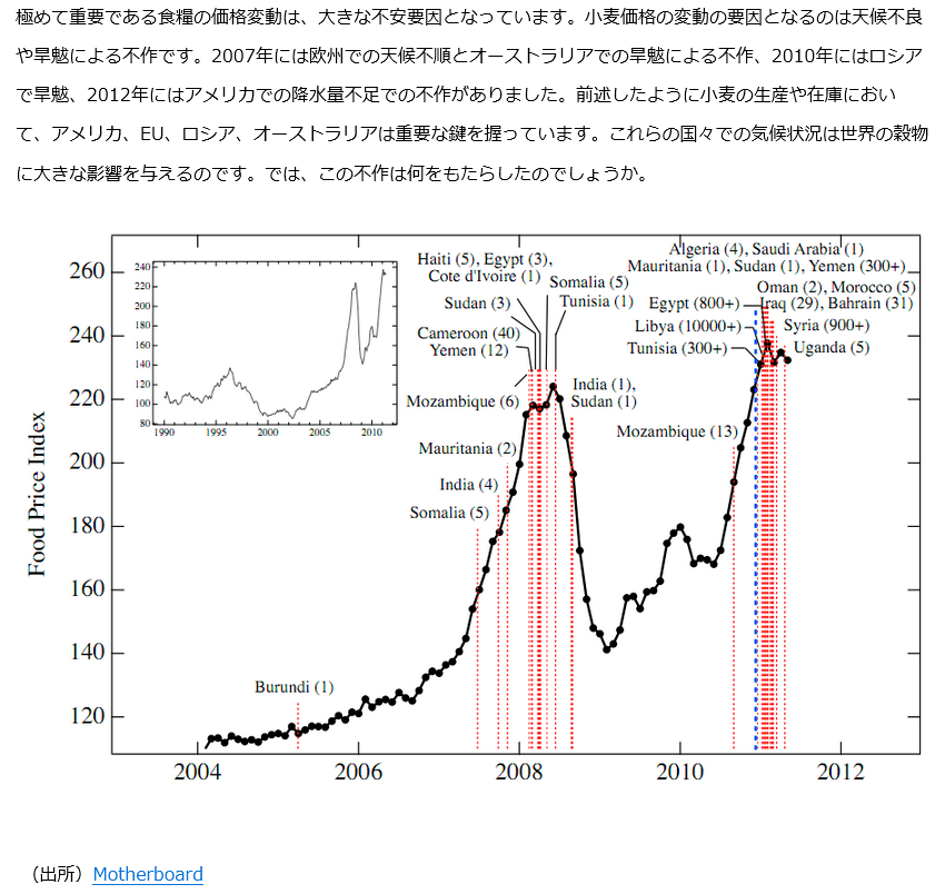 近年の小麦価格の上昇がもたらした最たる例が、中東・北アフリカでの暴動です。特に、2010年の価格高騰は「アラブの春」と呼ばれる社会革命をもたらしたことで有名です。チュニジアでの食糧暴動を発端に、社会暴動は北アフリカから中東地域に波及。結果、チュニジア、エジプト、リビア、イエメンでは革命により政権が打倒され、シリアでは深刻な社会情勢不安の末、ISISのような強力な武装勢力を誕生させるに至りました。エジプトが世界最大の小麦輸入国であるように、中東・北アフリカ地域では主食の小麦を輸入に頼っている国が多く、結果世界の小麦市場価格の影響を強く受けてしまいます。この地域の社会不安は、石油や天然ガス採掘にも影響を与え、さらに安全保障問題をも引き起こすのです。