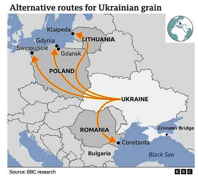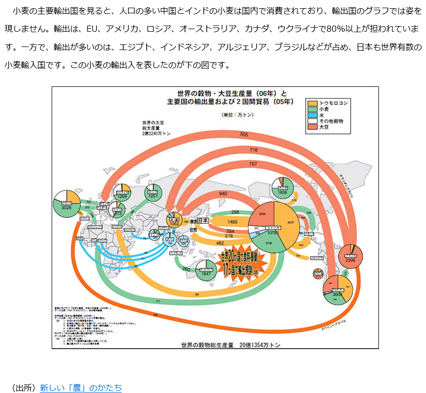 こちらは2006年とやや古い統計情報に基づいた地図ですが、世界の小麦の流れがよく表現されています。緑の線が小麦です。フランス産の小麦は、EU諸国やアルジェリアに、ロシア産はエジプトに、オーストラリア産はインドネシアに、アルゼンチン産はブラジルに、そして世界の穀物庫アメリカ産は、日本他世界各国に輸出されています。