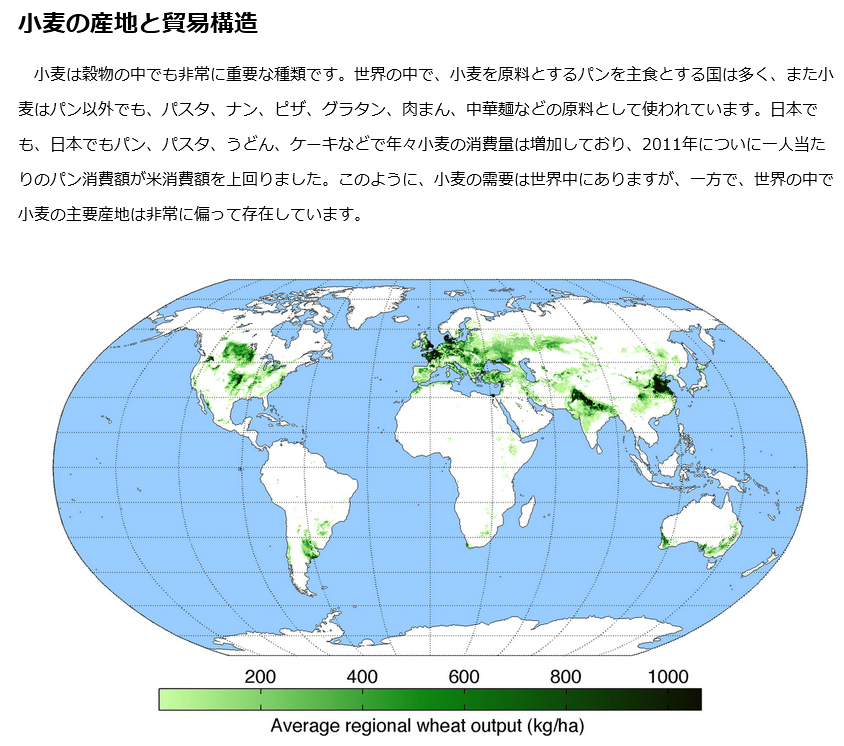 小麦は穀物の中でも非常に重要な種類です。世界の中で、小麦を原料とするパンを主食とする国は多く、また小麦はパン以外でも、パスタ、ナン、ピザ、グラタン、肉まん、中華麺などの原料として使われています。日本でも、日本でもパン、パスタ、うどん、ケーキなどで年々小麦の消費量は増加しており、2011年についに一人当たりのパン消費額が米消費額を上回りました。このように、小麦の需要は世界中にありますが、一方で、世界の中で小麦の主要産地は非常に偏って存在しています。