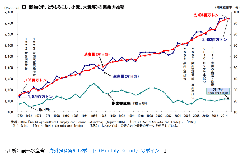ローマクラブの警鐘から40年。世界の食糧事情はどのように変化してきたのでしょうか。この40年間で世界の人口は増加、新興国の生活水準も上昇し食糧消費量が年々増加する中、世界は食糧生産を増やすことで乗り切ってきました。