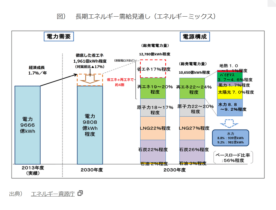 2015年、政府は日本の2030年のエネルギーミックスとして、LNG火力27%程度、石炭火力26%程度、再生可能エネルギー22〜24%程度、 原子力20〜22%程度、石油火力3%程度を目指すと定めた。