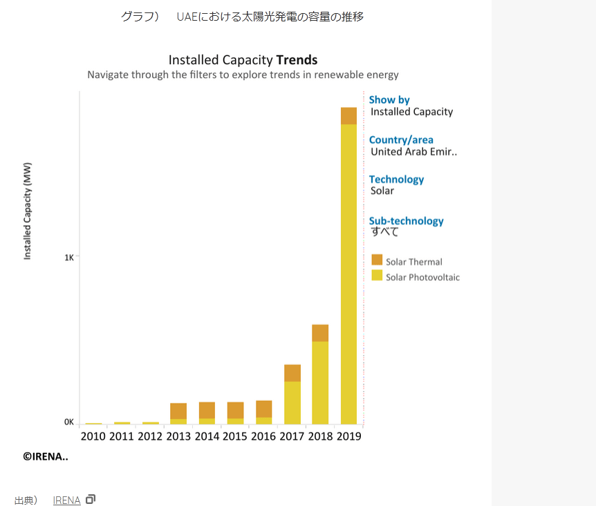 UAEの太陽光発電容量の推移を見ると、2016年以降ものすごいスピードで伸びているのが分かる。