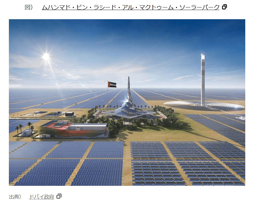 世界最大規模のソーラー発電施設「ムハンマド・ビン・ラシード・アル・マクトゥーム・ソーラーパーク」はUAEで既に一部稼働中だ。完成すると5ギガワットの発電容量を備え、年間650万トンを超えるCO2排出量を抑制できるとされる。 図) ムハンマド・ビン・ラシード・アル・マクトゥーム・ソーラーパーク 図)ムハンマド・ビン・ラシード・アル・マクトゥーム・ソーラーパーク