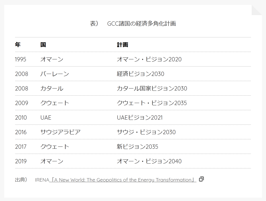 1995 オマーン オマーン・ビジョン2020 2008 バーレーン 経済ビジョン2030 2008 カタール カタール国家ビジョン2030 2009 クウェート クウェート・ビジョン2035 2010 UAE UAEビジョン2021 2016 サウジアラビア サウジ・ビジョン2030 2017 クウェート 新ビジョン2035 2019 オマーン オマーン・ビジョン2040