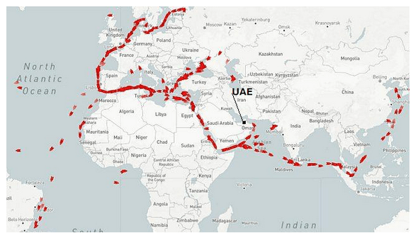 取材に訪れた時に停泊していた船の1つ、ギリシャ船籍のタンカーはAISのデータなどからロシア北西部tankers-midday-thurs-1536×861フィンランド湾に面するウスチ・ルガ(ウストルガ Ust-Luga)の港を出発し、地中海やスエズ運河を通ってやって来ていたものであることが分かった。積み荷は重油とみられる。左は、欧州タンカーの流れとUAEの位置。参照記事