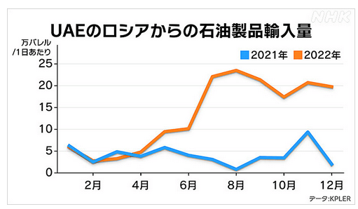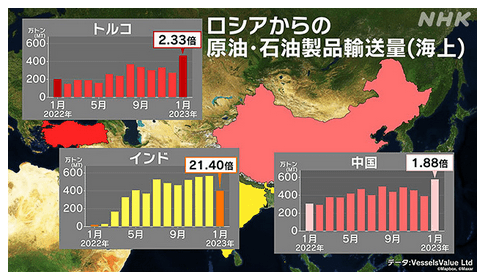 また、これらの国々は欧州連合(EU)、オーストラリア、日本、英国、カナダ、米国など制裁としてロシアの石油製品に「上限価格を設けた国」への精製品の輸出も増やした。
