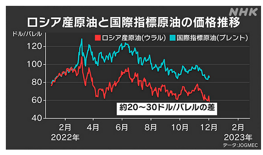 しかし、上限価格を低く設定しすぎると、ロシアが反発して供給量を減らし世界的に原油価格が高騰するおそれがあり、最終的に60ドルとなった。ロシアに制裁をかけながら世界の原油の供給量を守るという両面をにらんだ上限価格の設定は効果を発揮できるのか、今後の推移が注目されます。参照記事 』