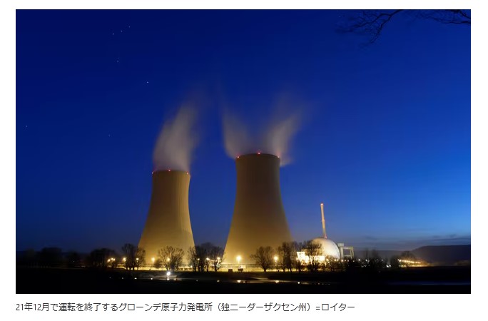 ドイツの脱原発は東京電力福島第1原子力発電所の事故を受け、11年5月に当時のメルケル政権が決めた。当時2210万キロワットあった独国内の原発の発電能力は年内のグローンデ原発などの停止で429万キロワットと約5分の1になる。10年は電力全体に占める原子力の割合は22%を占めていたのに対し、20年には11%に減った。