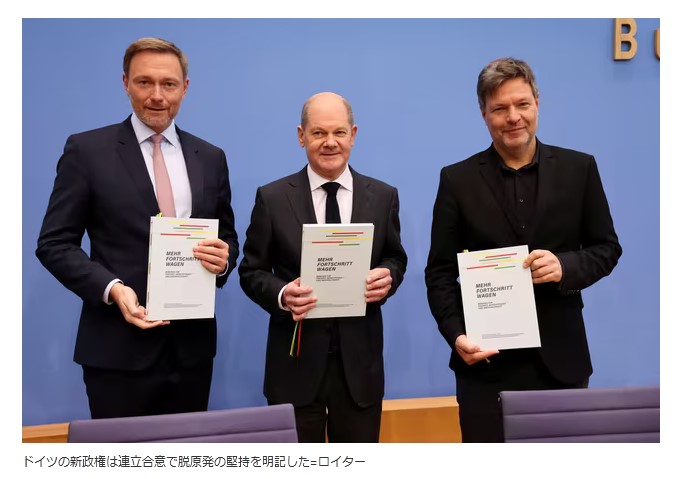 8日に発足したドイツの新政権も延長や再検討に否定的だ。そもそも連立を組む3党のうち緑の党は1980年代の反原発運動に端を発し、ショルツ首相のドイツ社会民主党は緑の党と連立を組んだ2000年に最初の脱原発政策を打ち出した経緯がある。今回の連立合意でも「我々はドイツの脱原発を貫く。再生エネの拡大と利用を明確に約束している」と明記した。