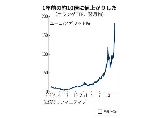 背景にあるのは天然ガス価格の高騰だ。昨冬の寒さによる在庫不足に、新型コロナからの経済回復による需要急増、風力発電の出力低下などの複合的な要因が重なり、欧州の天然ガス価格は春すぎからみるみる上昇。指標価格であるオランダTTFは10月上旬、過去最高となる1000キロワット時あたり約150ユーロと1年前の12倍の高値をつけた。企業や家計の負担は高まった。