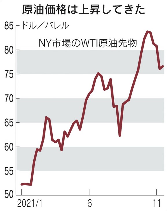 原油相場は10月に2014年以来7年ぶりの高値を付けた。足元では1バレル70ドル台で推移する。新型コロナウイルスの影響による部材や人手の供給制約にガソリン高も重なって各国でインフレが加速しており、世界経済の回復を遅らせるとの懸念が高まっている。
