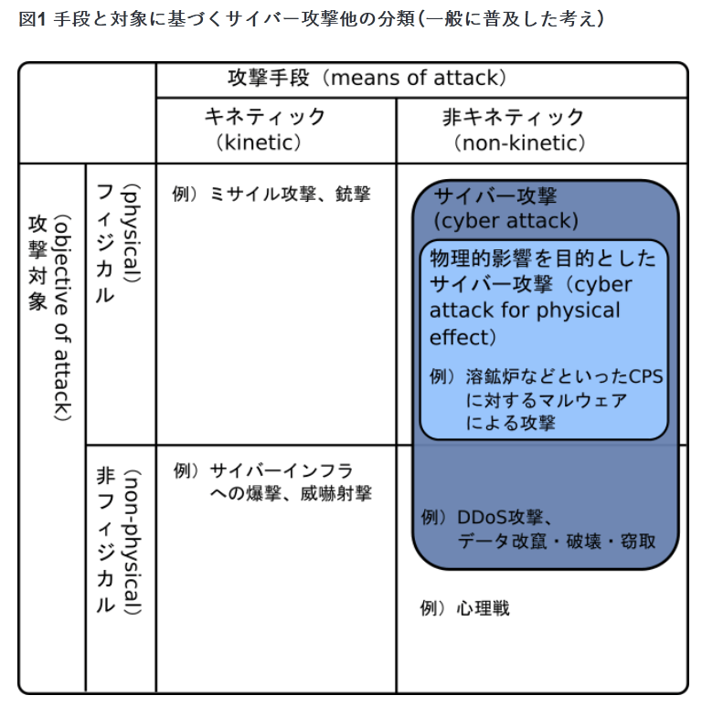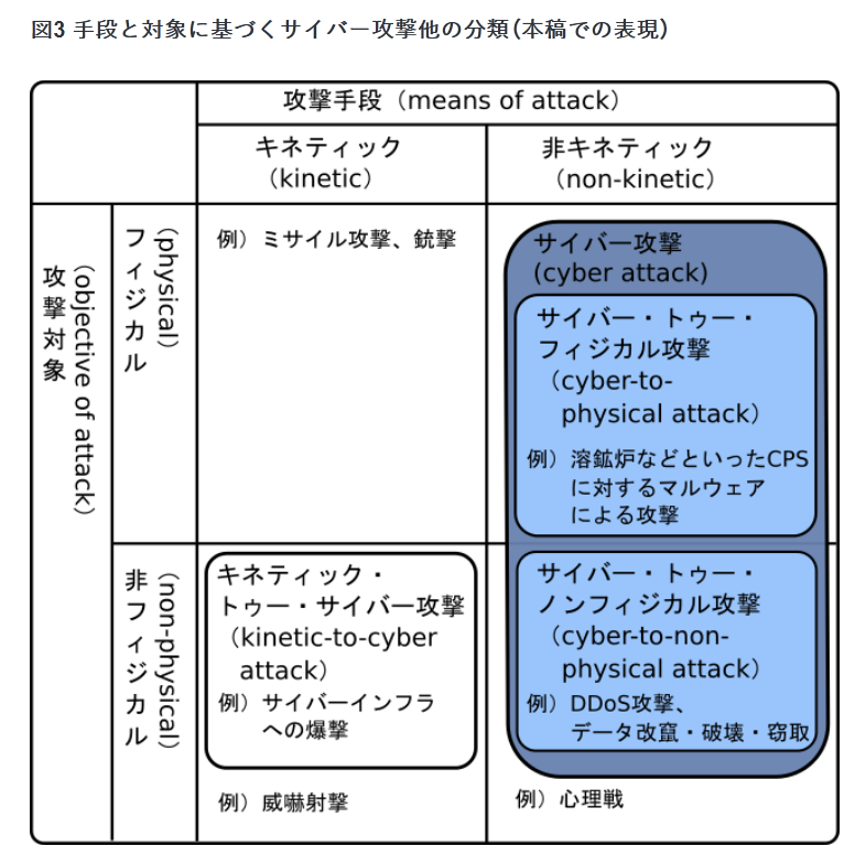 ここでは重要インフラへの攻撃をサイバー・トゥー・サイバー行動の例としてあげている。昨今の重要インフラはサイバーフィジカルシステムである場合が多いことを考えると、図1でいうところの「物理的影響を目的としたサイバー攻撃」も、ここの表現におけるサイバー・トゥー・サイバー行動に含まれていると考えることができる。
