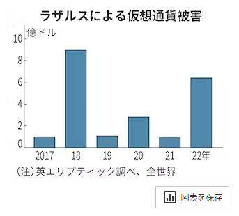 エリプティックによると、北朝鮮が17年以降に他国の事業者から窃取した仮想通貨は22年末までに総額23億ドル。うち日本が最多でベトナム(5億4千万ドル)、米国(4億9700万ドル)、香港(2億8100万ドル)と続いた。仮想通貨市場が急拡大し、セキュリティーが甘い事業者が多かった日本やベトナムが標的になったとみられる。