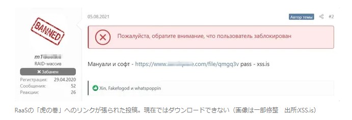 RaaSの「虎の巻」へのリンクが張られた投稿。現在ではダウンロードできない(画像は一部修整 出所:XSS.is)