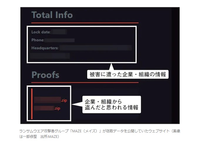 ランサムウエア攻撃者グループ「MAZE(メイズ)」が窃取データを公開していたウェブサイト(画像は一部修整 出所:MAZE)