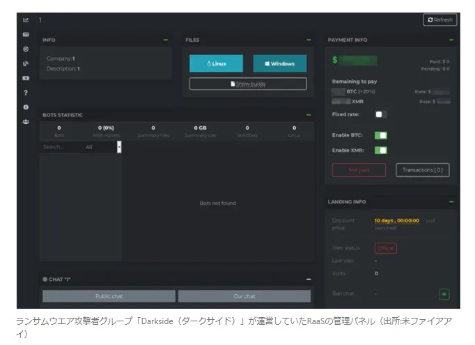 ランサムウエア攻撃者グループ「Darkside(ダークサイド)」が運営していたRaaSの管理パネル(出所:米ファイアアイ)