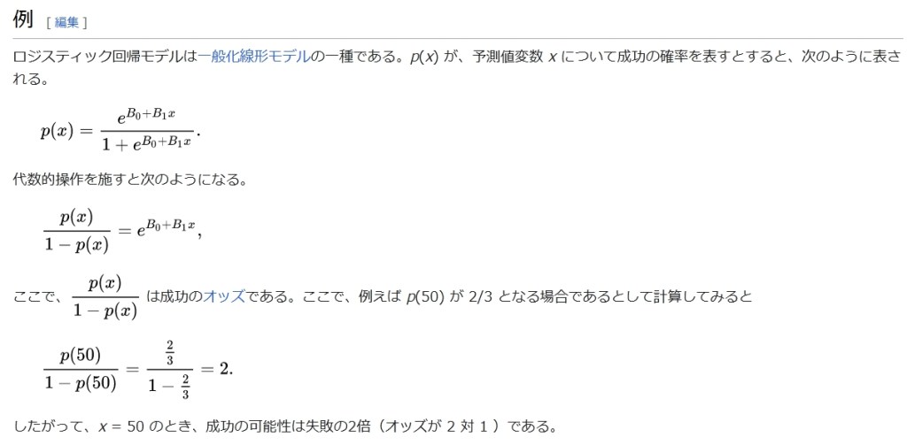 結果のオッズ(1から確率を引いたもので確率を割った値)の対数は、説明変数 Xi の線形関数としてモデル化される。これを次のようにも表せる。