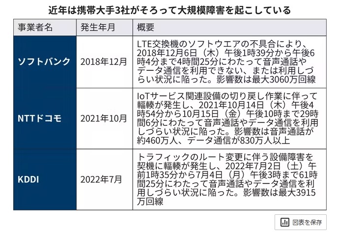 携帯大手の大規模障害は近年だけでも、2018年12月のソフトバンク、21年10月のNTTドコモ、今回のKDDIと相次いでいる。毎回、影響の大きさに驚かされる。今回も携帯インフラのもろさを改めて痛感すると同時に、今後は競争を超えた協調も必要なのではないかと感じた。
