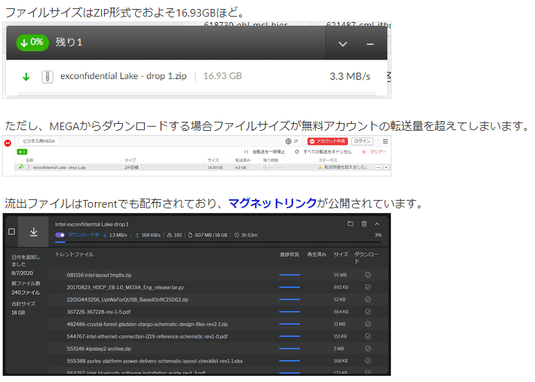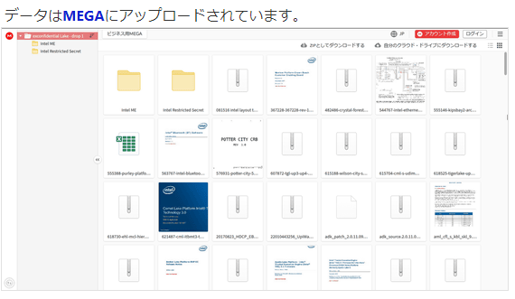 『ハッカーは「Intel exconfidential(社外秘) Lakeがリリースされました」とコメントをつけて公開したファイルは、厳格な秘密保持契約の下で管理されていたもの。ハッカーがKottmann氏に語ったところによれば、保護されていないCDN上にIntelのサーバーが発見されたそうで、簡単に侵入できたとのこと。