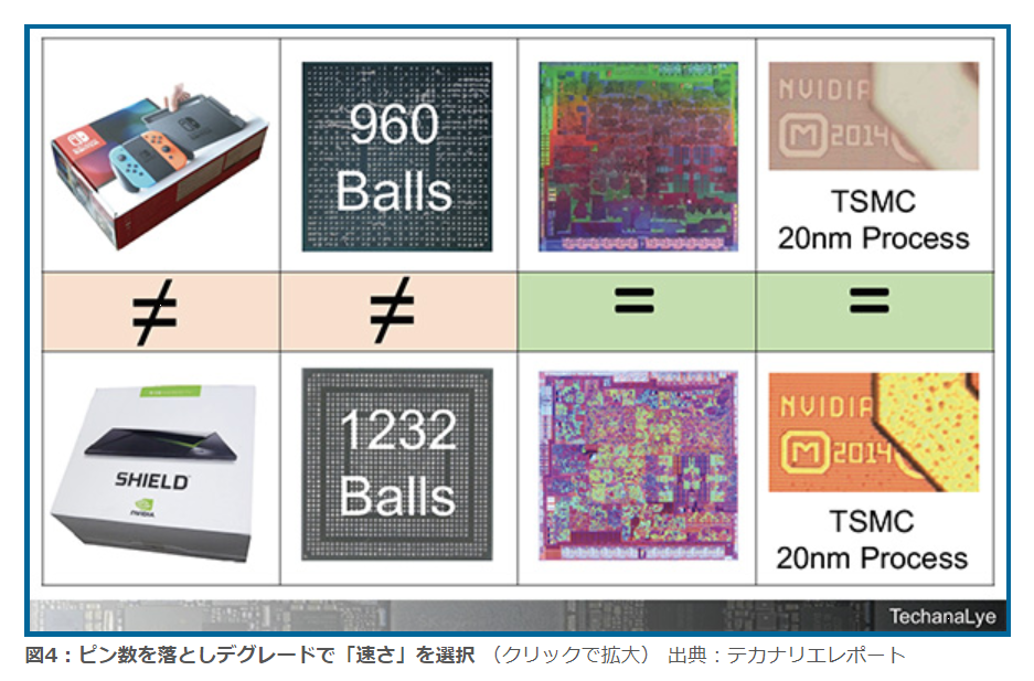 Shield Proに使われるTegra X1のチップパッケージは「1232」端子を持っている。一方Nintendo Switch向けのTegra X1は「960」端子。実に22%端子数が削減されている。単純計算になるが、おおよそ5分の4しか機能を使っていないことになる。「カスタマイズされたTegra」という表現は正しい。グレードアップのカスタマイズではなく、デグレードされたカスタマイズということなのだろう。これもカスタマイズであることは間違いない!!』