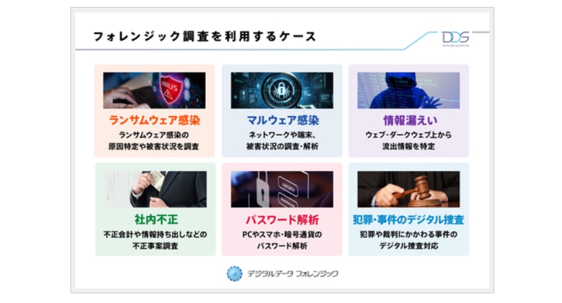 ランサムウェアを中心としたサイバーインシデントの被害や、退職者による情報持ち出しの不正事案は昨今広がる一方で、どのような規模の法人であっても、狙われるのは不可避と言っていい。こうした中、万が一の場合に相談できる相手として、また調査や診断を依頼する相手として、デジタルデータソリューションが運営する「デジタルデータフォレンジック」の名を覚えておいて損はないだろう。 』