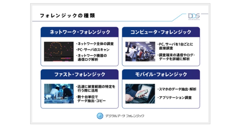 フォレンジックの種類は、大きく分けて「ネットワーク・フォレンジック」「ファスト・フォレンジック」「コンピュータ・フォレンジック」「モバイル・フォレンジック」の4種類がある。調査するデバイスや目的に合わせて使い分けしているという。