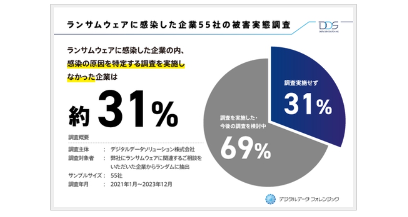 同社が2021年から2023年にかけて55社を対象に行なった調査では、ランサムウェアに感染し、感染の原因を特定する調査を実施しなかった企業は実に31%も占めていたとのことだ。