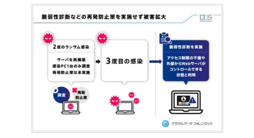 この例は、ランサムウェア感染の原因追求や再発防止を怠ったがために被害が拡大した典型例であり、診断をもっとも必要とするケースと言える。