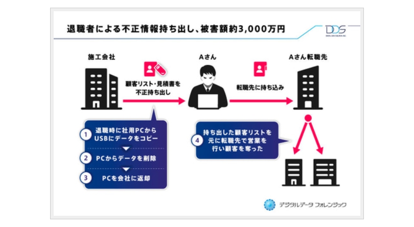 調査の結果、メールやクラウドに関しては痕跡は見付からなかったものの、USBメモリを用いて約80件のデータをコピーし、持ち出されていたことが発覚。それらは顧客情報にとどまらず、技術関連の機密データや、取引先に対する見積書などが含まれており、被害総額は約3千万円にもおよぶことが判明したという。