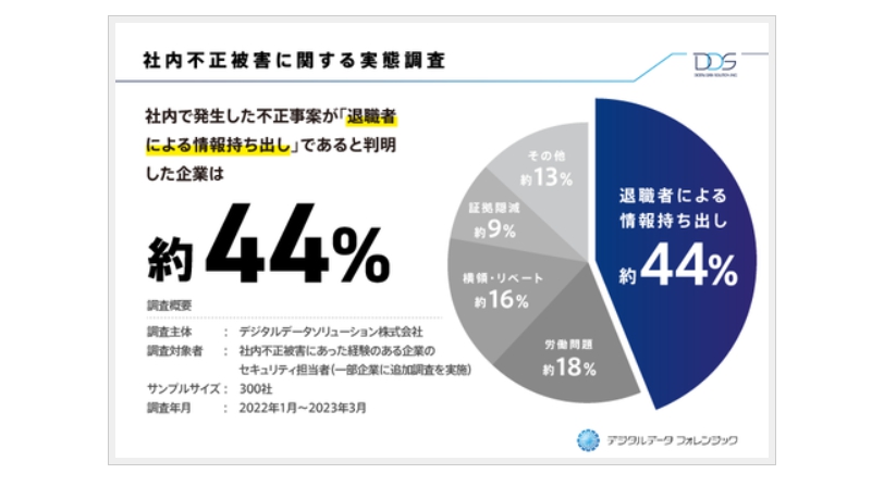 デジタルデータソリューションによると、こうした退職者による情報の持ち出しは非常に多く、同社が2022年から2023年にかけて社内不正被害に遭った企業300社を対象に行なった調査でも、退職者による情報持ち出しは、全社内不正事の44%を占めるなど、ダントツに多かったのだそうだ。
