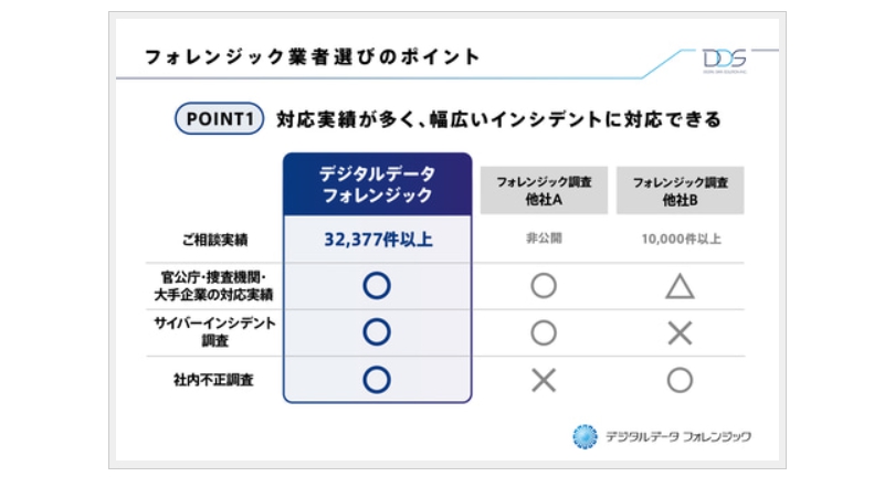 デジタルデータソリューションが展開する「デジタルデータフォレンジック(DDF)」は、国内44万件以上のデータインシデントに対応してきた同社が運営する、フォレンジック調査の専門部隊だ。