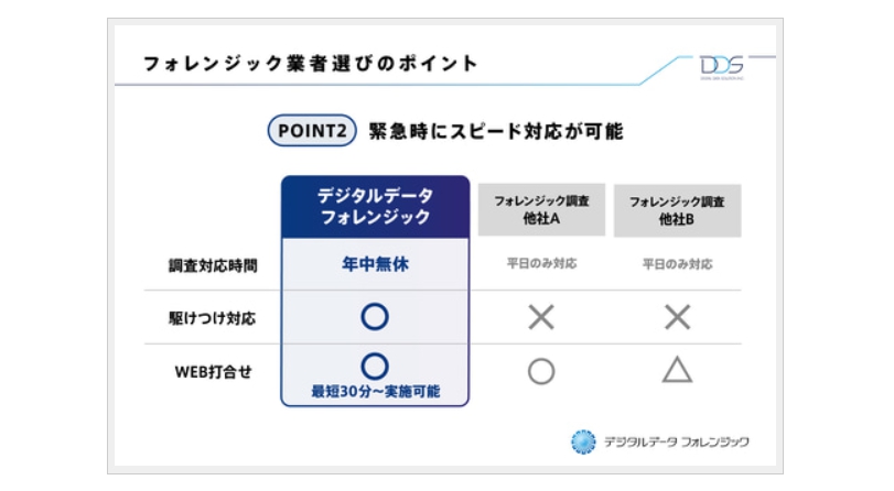 デジタルデータソリューションは24時間365日の受付体制を整えており、休日はもちろん年末年始などであっても、インシデントに対して即日の対応が受けられる。初動対応のWeb打ち合わせを初回の問い合わせから最短30分で実施できるほか、即日の現地駆け付けにも対応しているので、突然のアクシデントで社内が大混乱に陥り、何から手を付けて良いか分からない場合も、頼もしいパートナーとなってくれる。