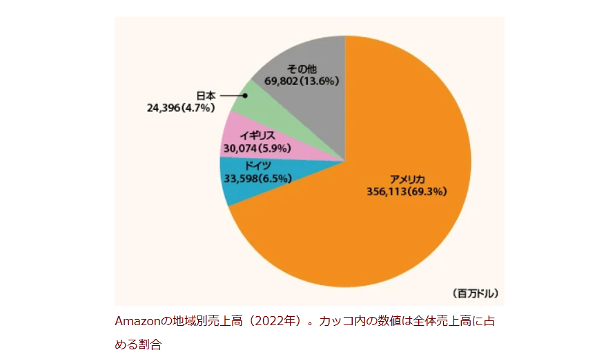 Amazonの地域別売上高 アメリカ → 3561億1300万ドル(前期比13.4%増) ドイツ → 335億9800万ドル(同10.0%減) イギリス → 300億7400万ドル(同7.7%増) 日本 → 243億9600万ドル(同5.7%増) その他 → 698億200万ドル(同9.9%増)