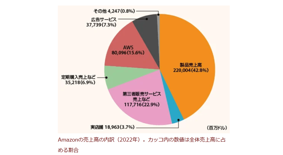 Amazonの売上高の内訳(2022年)。カッコ内の数値は全体売上高に占める割合