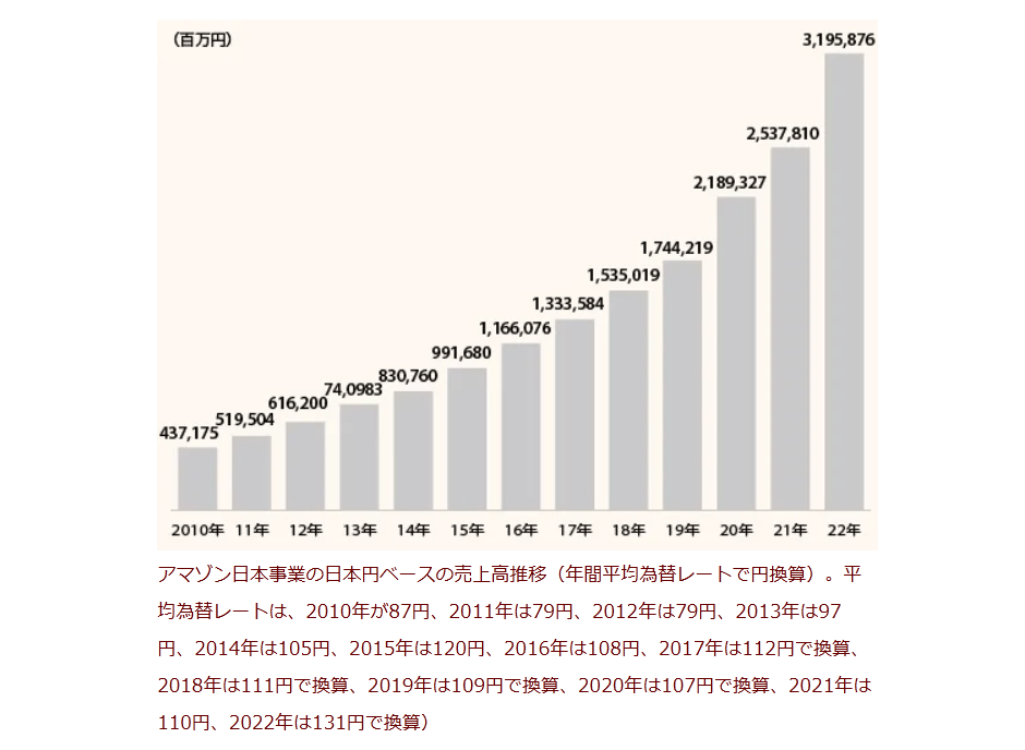 アマゾン日本事業の日本円ベースの売上高推移(年間平均為替レートで円換算)。平均為替レートは、2010年が87円、2011年は79円、2012年は79円、2013年は97円、2014年は105円、2015年は120円、2016年は108円、2017年は112円で換算、2018年は111円で換算、2019年は109円で換算、2020年は107円で換算、2021年は110円、2022年は131円で換算) アマゾン日本事業の日本円ベースの売上高推移(年間平均為替レートで円換算)。平均為替レートは、2010年が87円、2011年は79円、2012年は79円、2013年は97円、2014年は105円、2015年は120円、2016年は108円、2017年は112円で換算、2018年は111円で換算、2019年は109円で換算、2020年は107円で換算、2021年は110円、2022年は131円で換算)