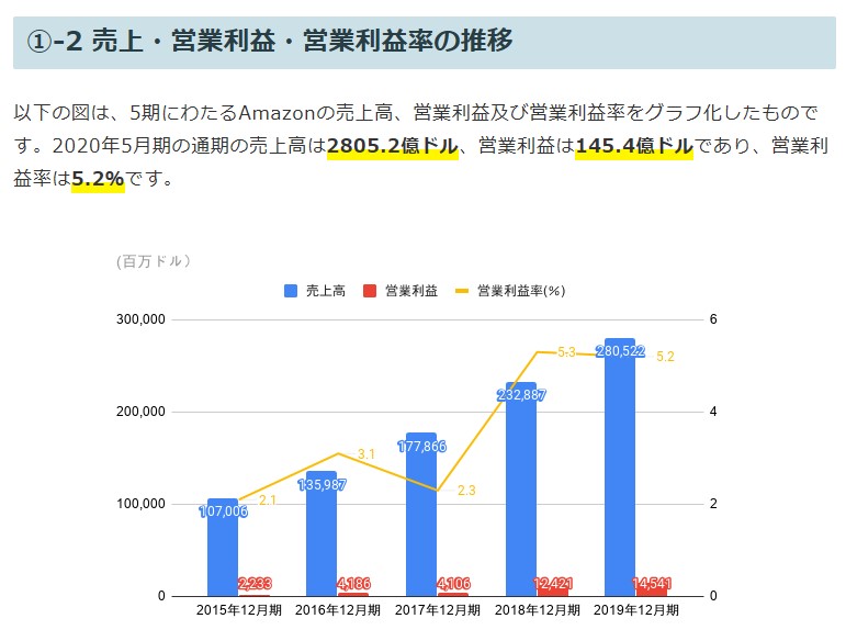 以下の図は、5期にわたるAmazonの売上高、営業利益及び営業利益率をグラフ化したものです。2020年5月期の通期の売上高は2805.2億ドル、営業利益は145.4億ドルであり、営業利益率は5.2%です。 Amazon 利益率