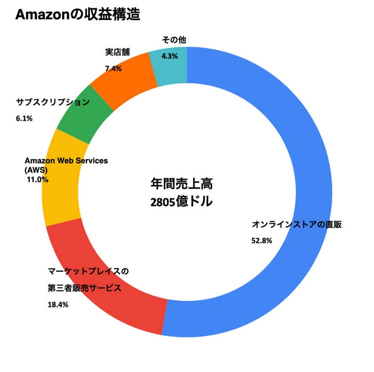 Amazonの年間を通しての売上は2805億ドルにのぼり、主な収益構造は以下の6つの事業に区分されています。 オンラインストアの直販サービスが、52.8%と全体の売上の約半数を占めています。 各事業ごとの数値や展開しているサービスは、以下の通りです。