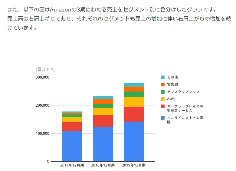 また、以下の図はAmazonの3期にわたる売上をセグメント別に色分けしたグラフです。 売上高は右肩上がりであり、それぞれのセグメントも売上の増加に伴い右肩上がりの増加を続けています。