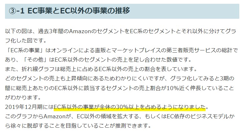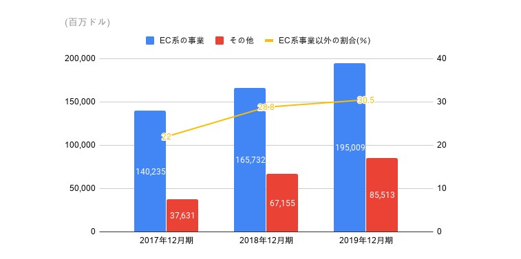 以下の図は、過去3年間のAmazonのセグメントをEC系のセグメントとそれ以外に分けてグラフ化した図です。 「EC系の事業」はオンラインによる直販とマーケットプレイスの第三者販売サービスの総計であり、「その他」はEC系以外のセグメントの売上を足し合わせた数値です。 また、折れ線グラフは総売上に占めるEC系以外の売上の割合を表しています。 どのセグメントの売上も上昇傾向にあるためわかりにくいですが、グラフ化してみると3期の間に総売上あたりのEC系以外に該当するセグメントの売上割合が10%近く伸長していることがわかります。 2019年12月期にはEC系以外の事業が全体の30%以上を占めるようになりました。 このグラフからAmazonが、EC以外の領域を拡大する、もしくはEC依存のビジネスモデルから徐々に脱却することを目指していることが推測できます。