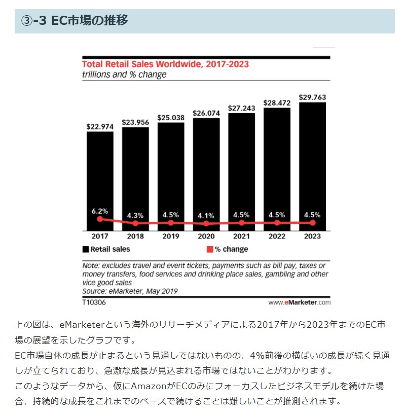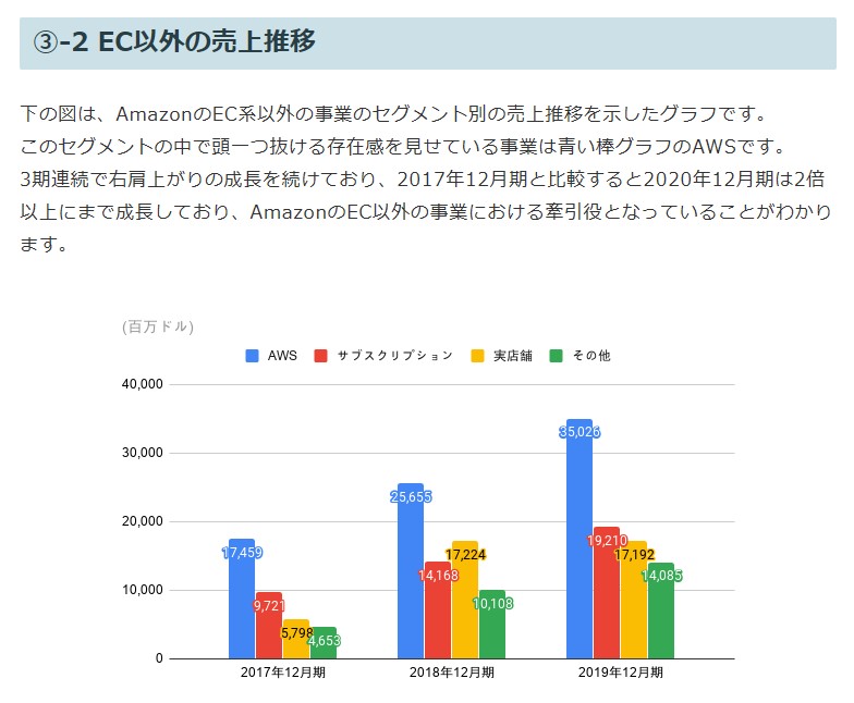 下の図は、AmazonのEC系以外の事業のセグメント別の売上推移を示したグラフです。 このセグメントの中で頭一つ抜ける存在感を見せている事業は青い棒グラフのAWSです。 3期連続で右肩上がりの成長を続けており、2017年12月期と比較すると2020年12月期は2倍以上にまで成長しており、AmazonのEC以外の事業における牽引役となっていることがわかります。 EC以外の売上推移 ③-3 EC市場の推移 EC市場の今後