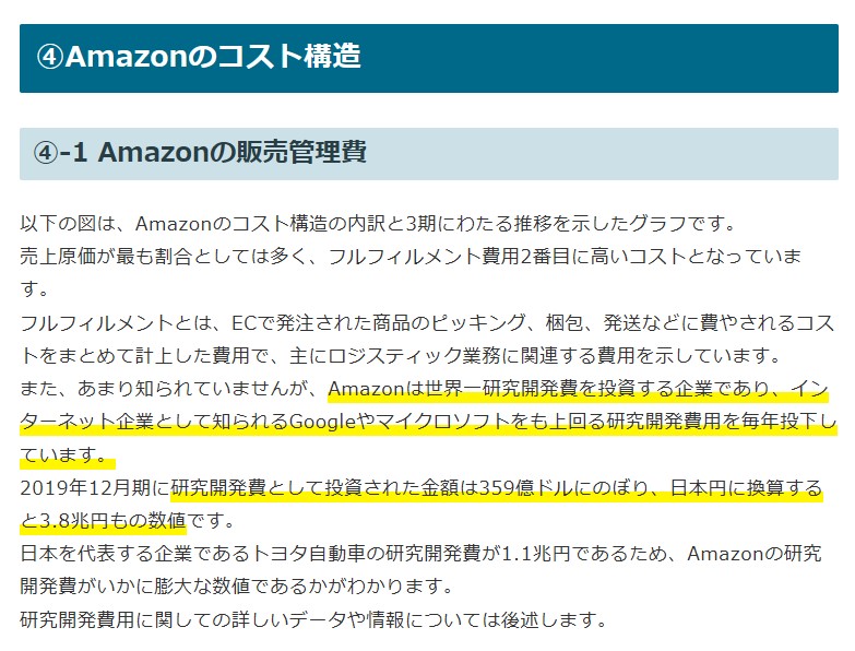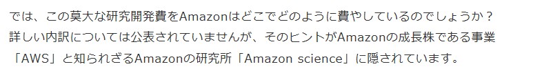 など多岐に渡り、Amazonの最もホットな投資分野であり成長の起爆剤であることが推測できます。 また、「Amazon Echo」や、無人店舗「Amazon Go」、「ドローンによる空飛ぶ宅配」などAWS領域以外の投資も積極的に行われており、世界一研究開発費用を使う企業「Amazon」の投資は世界中が目を離せないトピックです。 ⑤-3 最新の投資情報